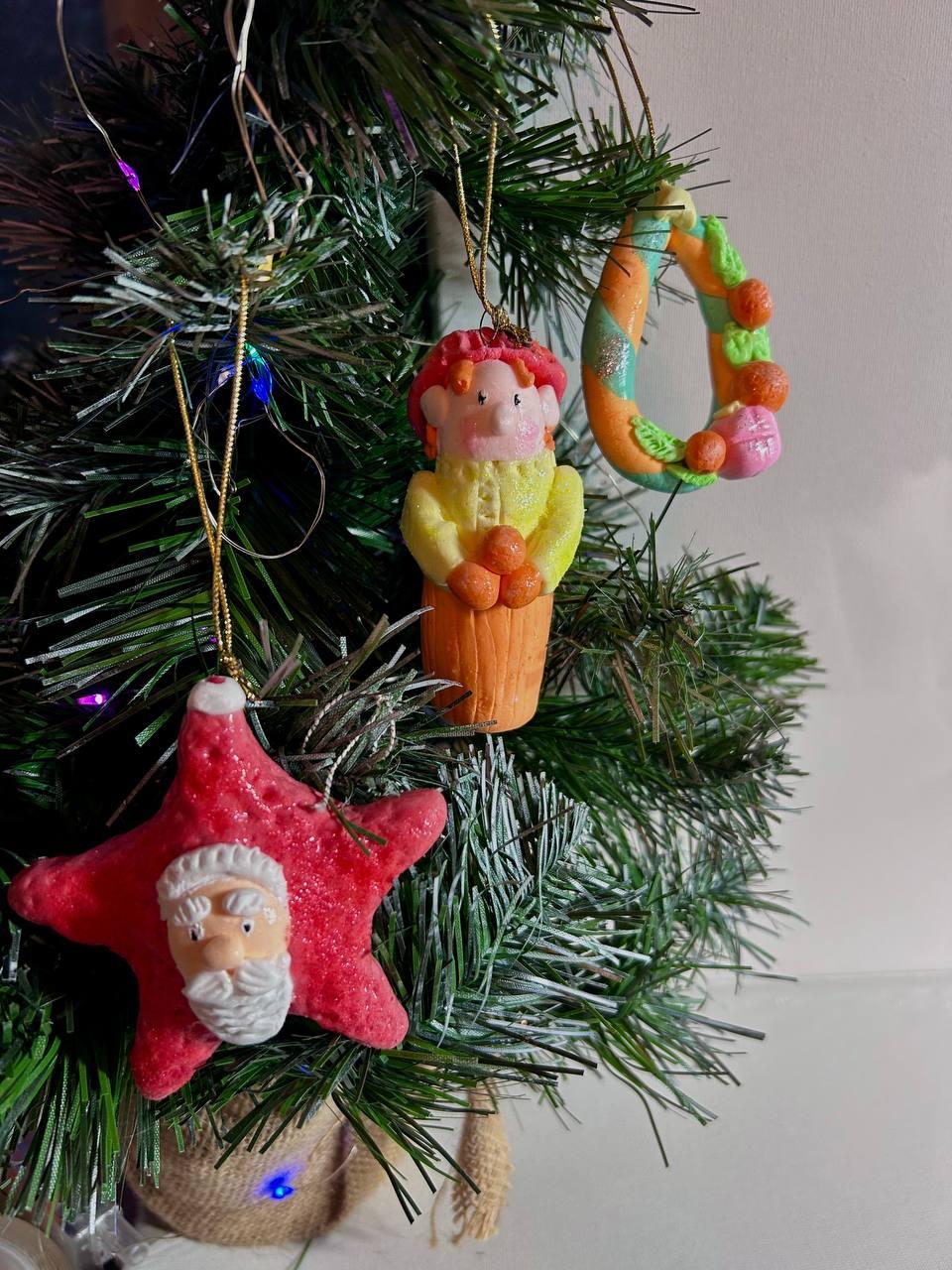 Набір складається з трьох унікальних фігур виготовлених в ручну і з любовʼю.Стане чудовою прикрасою святкової ялинки і помешкання.